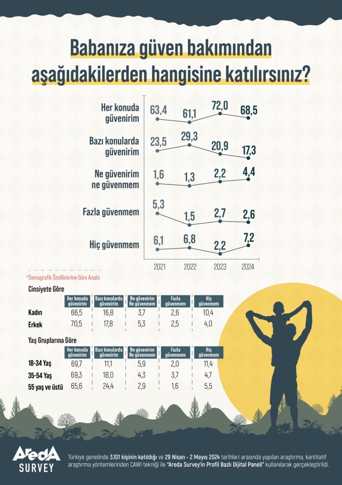 Areda Survey araştırma şirketi, Babalar Günü’ne günler kala Babaya Güven Araştırması gerçekleştirdi. Türkiye genelinde 3 bin 101 kişinin katılımıyla gerçekleşen araştırmaya göre Türk halkının yüzde 68,5’i babasına her konuda güvendiğini ifade ediyor.