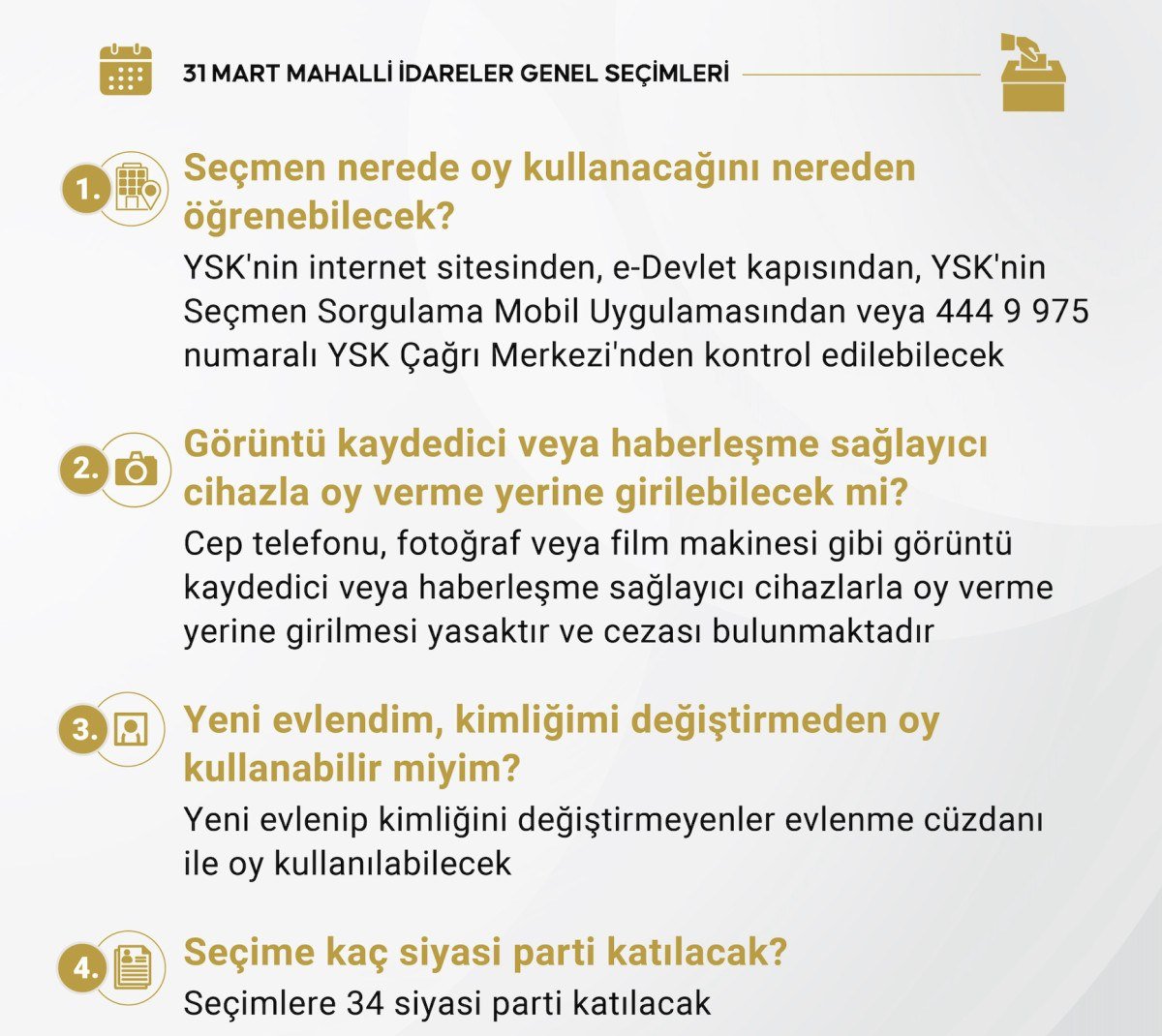 Seçmenler, nerede ve hangi sandıkta oy kullanacağını, YSK’nin internet sitesinden, e-Devlet kapısından, YSK’nin Seçmen Sorgulama Mobil Uygulamasından veya 444 9 975 numaralı Çağrı Merkezi’nden kontrol edebilecek. Seçmenin nerede oy kullanacağını gösteren seçmen bilgi kağıdının getirilmesi zorunlu olmayacak.