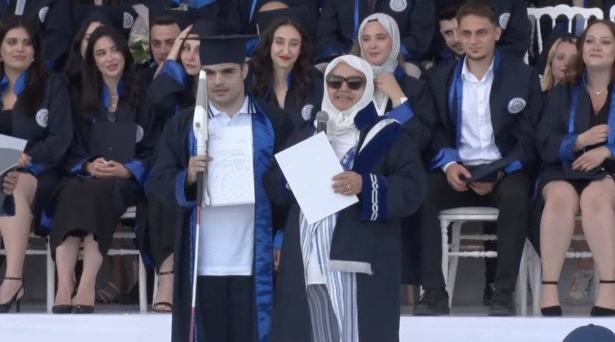 Doğuştan yüzde 100 görme engelli olan 22 yaşındaki Eyüp Ensar Ögel, eğitim hayatı boyunca annesi Fatma Ögel’in desteğiyle okula devam etti.