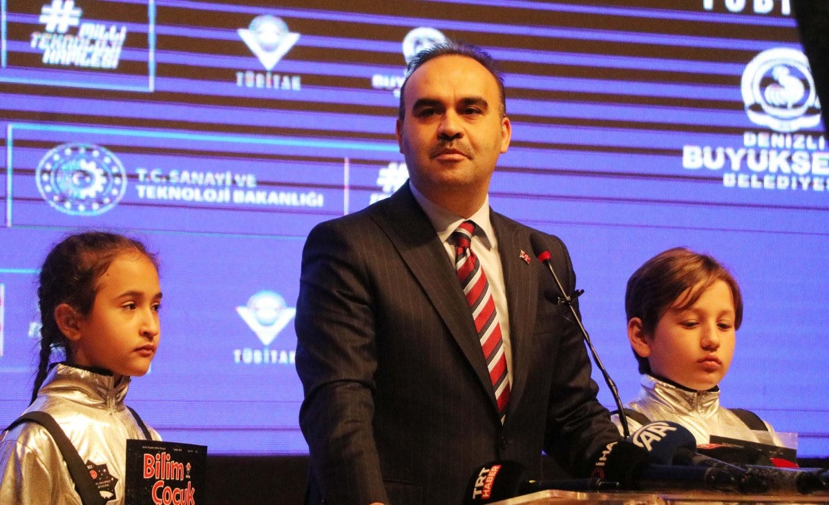Bakan Kacır, kürsüye Denizli Bilim Merkezi’nde uzay ve havacılık atölyesi kıyafetleri giyen 10 yaşındaki Ayşe Meva Sadırlı ve Kemal Cabbar ile birlikte çıktı.