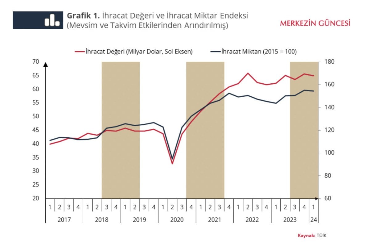 İçinde bulunduğumuz sıkılaşma dönemine odaklanıldığında ise ihracatın, dış talebin de desteğiyle nominal olarak gücünü koruduğu görülürken miktar bazında ılımlı bir artış eğilimi göze çarpıyor.