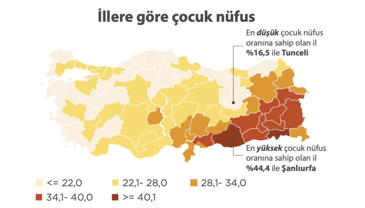 ADNKS sonuçlarına göre illerin toplam nüfusları içindeki çocuk nüfus oranları incelendiğinde, 2023 yılında en yüksek çocuk nüfus oranına sahip olan il, yüzde 44,4 ile Şanlıurfa oldu. Şanlıurfa ilini yüzde 40,5 ile Şırnak, yüzde 38,2 ile Ağrı ve Muş izledi.