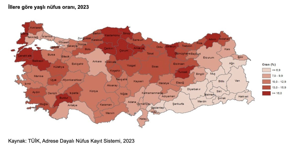 Yaşlı nüfus oranının en yüksek olduğu il, 2023 yılında yüzde 20,0 ile Sinop oldu. Bu ili yüzde 19,5 ile Kastamonu, yüzde 18,3 ile Giresun izledi. Yaşlı nüfus oranının en düşük olduğu il ise yüzde 3,5 ile Şırnak oldu. Bu ili yüzde 4,0 ile Hakkari, yüzde 4,2 ile Şanlıurfa izledi.
