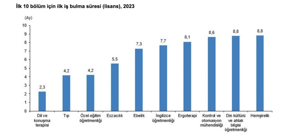 Lisans mezunlarının mezuniyetleri sonrası ilk iş bulma süre ortalamasının en kısa olduğu bölümler; dil ve konuşma terapisi (2,3 ay), tıp (4,2 ay), özel eğitim öğretmenliği (4,2 ay), eczacılık (5,5 ay) ile ebelik (7,3 ay) oldu.